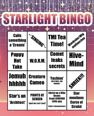 Star streams on Twitch, usually on Tuesday, Saturday, and Sunday. Her content is mostly video games, with an occasional art stream. Very occasionally she'll have guests like Comet or Jem to keep her sane.
